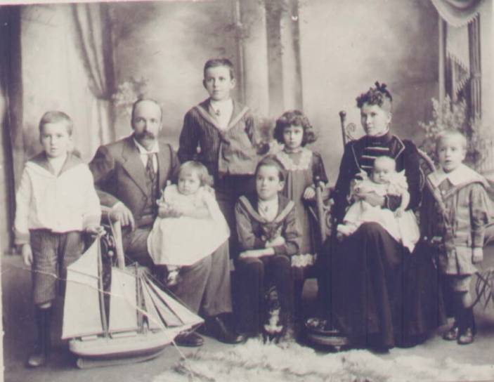 left to right : Leslie, Harry with Phyllis on Knee, Horace, Eric, Maude, Kate with Dorothy on Knee, Humphrey.