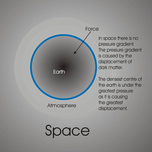 The planetary bodies are enveloped in the densest of material imaginable, yet the individual particles that the dark matter is made of have effectively no mass. They act as a dense liquid; at times they even act as though they are solid. Because they are massless they allow the planets and any objects to pass unimpeded, never slowing. Because they do have a small mass nevertheless, they cause a body that starts to move, to be held back until the dark matter flows around it, so creating inertia. The displacement of a body within the dark matter creates a pressure gradient, which is zero out in space, and continues to increase toward the centre of the body, at which point the displacement is maximal. If a body is orbiting in the “fluid” of the dark matter, then it will be carried around indefinitely in a whirlpool. There is no force between bodies at a distance, or else they would rapidly aggregate, since they could never remain in a fixed position. The dense dark matter that exists in any apparent “vacuum” acts for the purpose of transmission of waves of all sorts, as though it is solid. This suggests that there is a structure to the dark matter so that light for instance is vibrated in all directions at enormous speeds, without apparent loss of strength over unimaginable distances. The particles transmit or conduct light, but do not move relative to each other. They are massless, separable by inertia; yet act as though joined in order to propagate light waves, microwaves and magnetic forces.