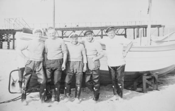 In the picture of the "GVH" (Gladys Violet Hubbard), are seen Buff Hubbard, Jimmy Ellingsworth, Siddy Wilson, Bertie Hubbard, and "Brownie" (George Brown). The boat was first owned by John Hubbard, then Gladys, then Bertie and Buff. It had a Kelvin engine. In the summertime it was used for pleasure trips to Scroby, and sometimes trips to Cromer, Lowestoft or Aldeborough.