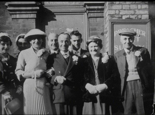 Francis Rice and his wife Hannah brought up five children at the row house- they were Tessie, born 16/12/20, who married John Ecclestone; Gladys, born 26/2/22; John; Sewell; and Arthur. Tessie and John Ecclestone had a daughter- Louise; Gladys and John remained single. Arthur's wife was Daphne, they were childless. Sewell married Sylvia and their son is Roger. In the wedding photograph, Tessie is in the white dress with pleats. To her left is Billy Ecclestone, brother of the bridegroom, then John Ecclestone, Arthur Rice, Hannah Rice, and on the extreme right of the photo is Jack Ecclestone, father of the bridegroom.