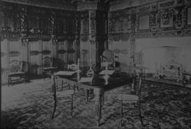 In Palmer's time the ceiling  remained  intact  and was quite remarkable. The  pendant  ceiling  was  divided  into six compartments  enriched  with  mouldings, fruits and flowers. The original  window  also  existed entire, having fourteen lights and latticed panes, all in two tiers, and in an oak carved frame.