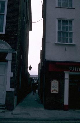 At the north‑west corner is in 1992, Ian Miller Associates, Chartered Quantity Surveyors, at 32 Hall Plain. On the south‑west corner is Allen's of Middlegate, public house. There is a door into the row from the corner of Allen's, numbered 1a. The buildings on the south side of this row have been converted from an old warehouse into smart small shops. At present, nos.3 and 4 are vacant and "To Let". no.3 was "Buffalo". Then there is "Bubbles", and no.2 is Rare Cuts hairdressers. Angie,(1987) now here had a hairdressers above Friends Bistro in Deneside for a while, and spent a year or two on a kibbutz, returning to start this hairdressers. At the south‑east corner of the row is Tucker, tea coffee and hot snacks, licensed restaurant. On the north side is Lanes Bistro, a pleasant little snack shop that sells snack meals and teas. There is another shop there, still empty, and an empty office also.